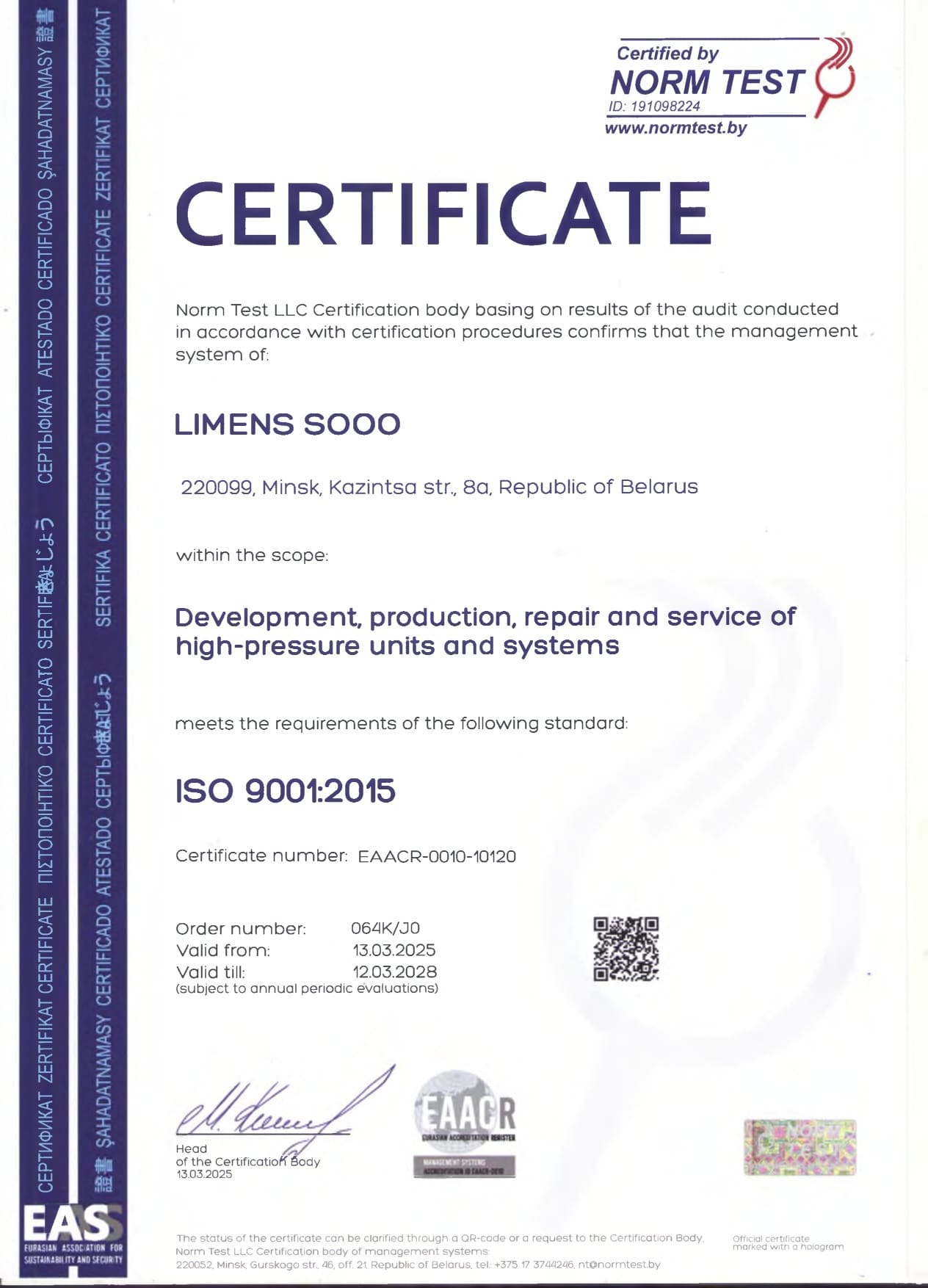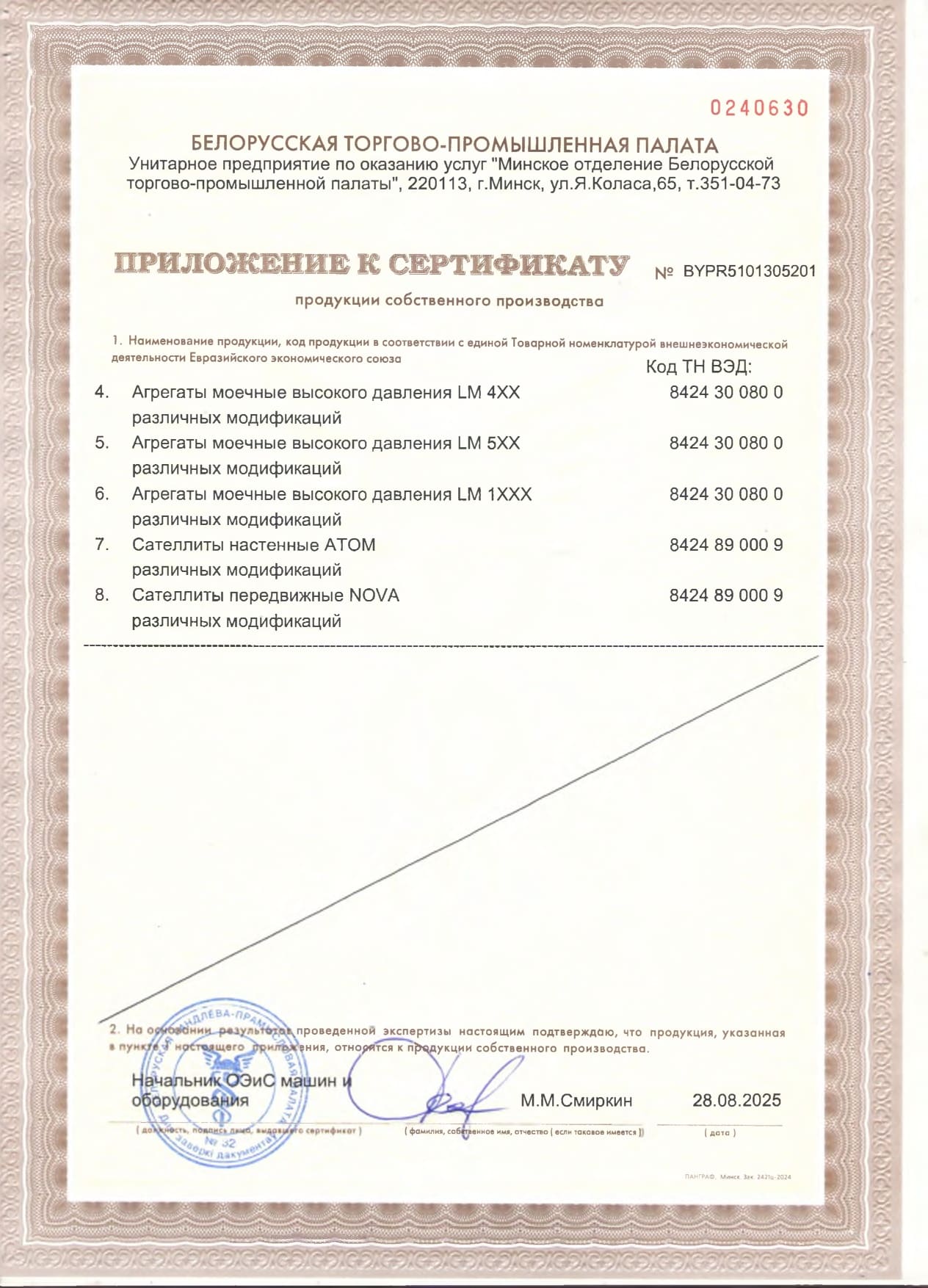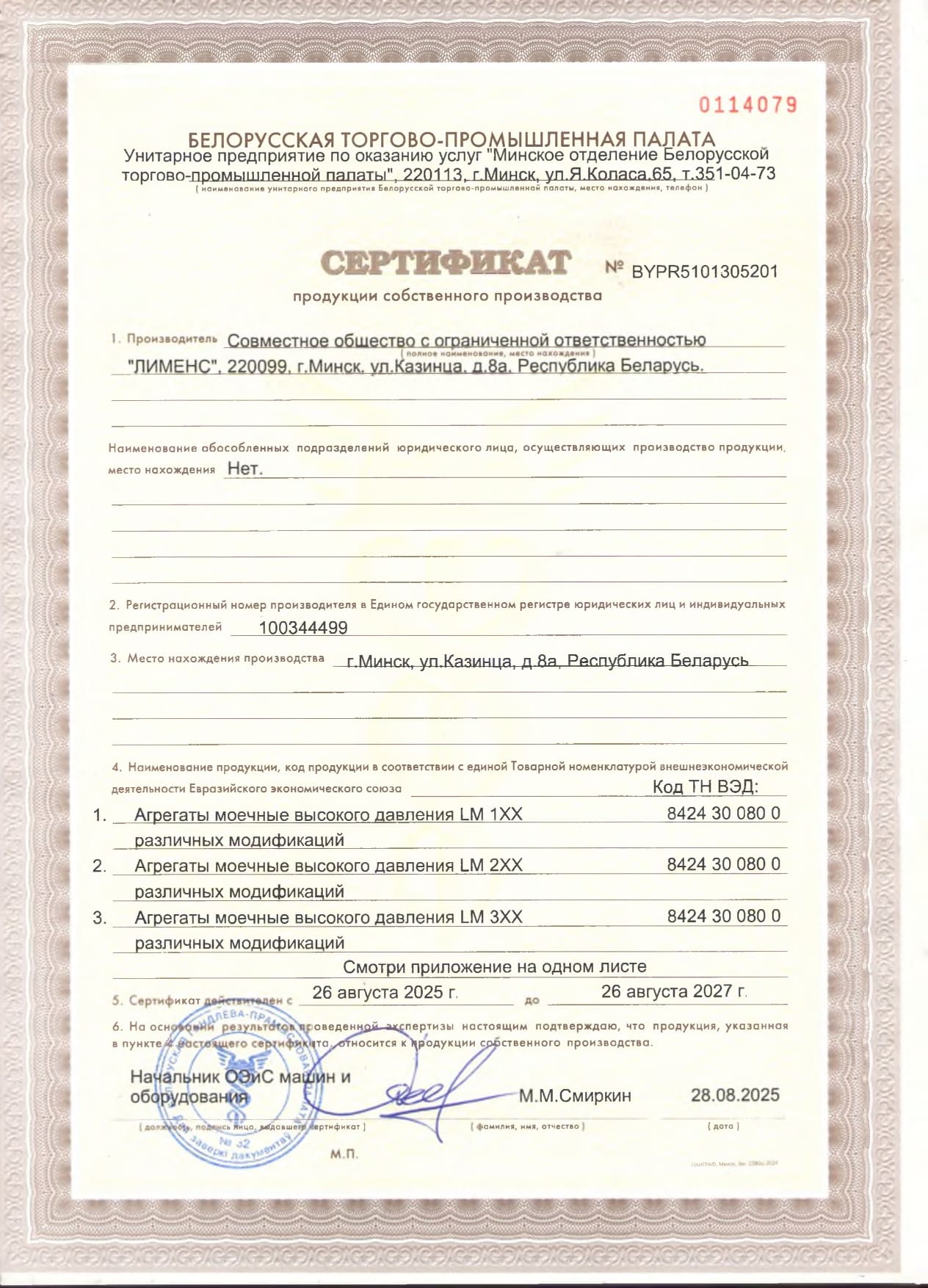 Продукция компании имеет сертификат собственного производства на территории республики Беларусь и декларацию о соответствии таможенного союза, что указывает на надежность отечественного производителя и стабильного партнера в странах СНГ.