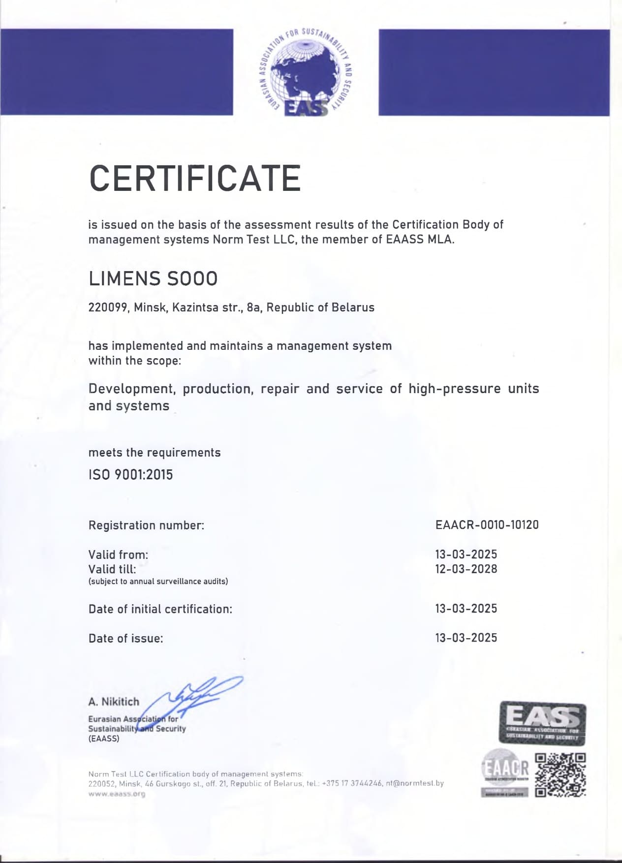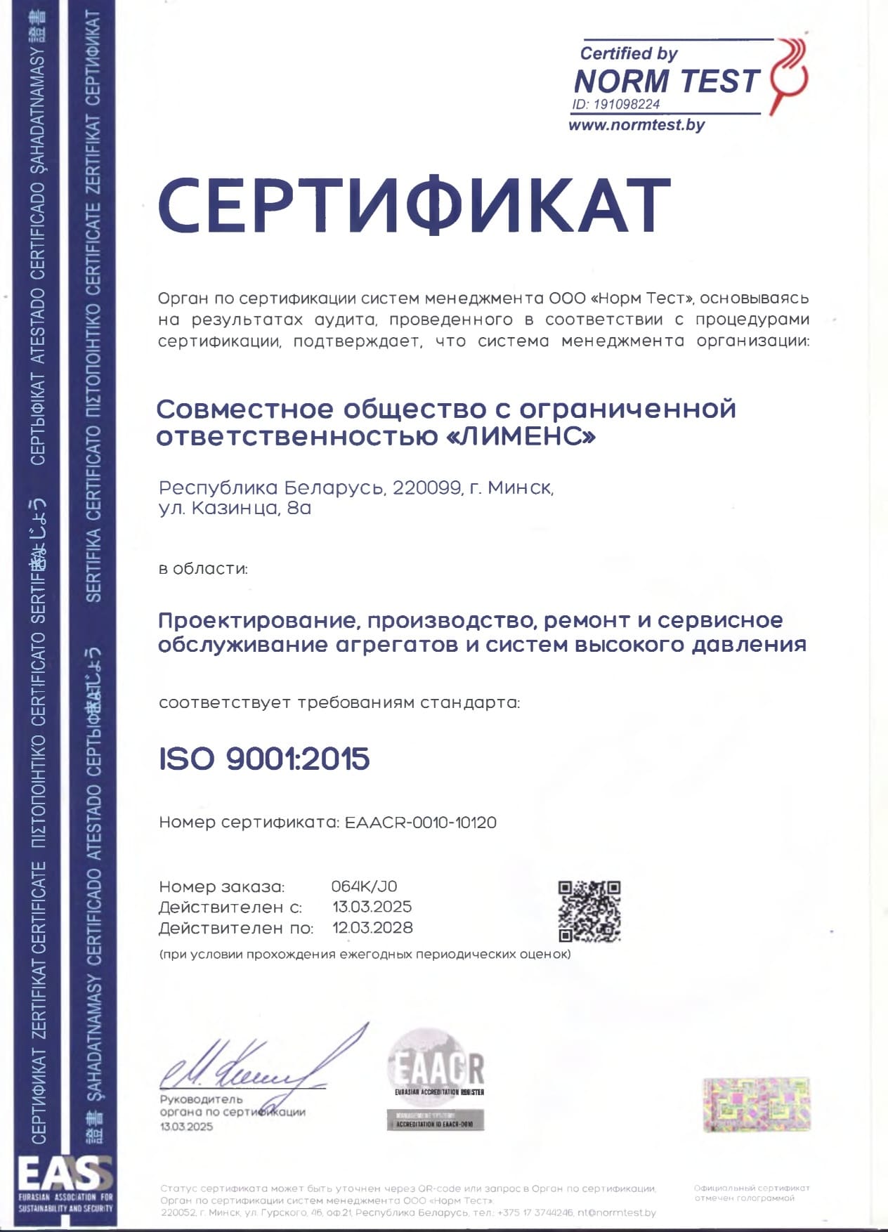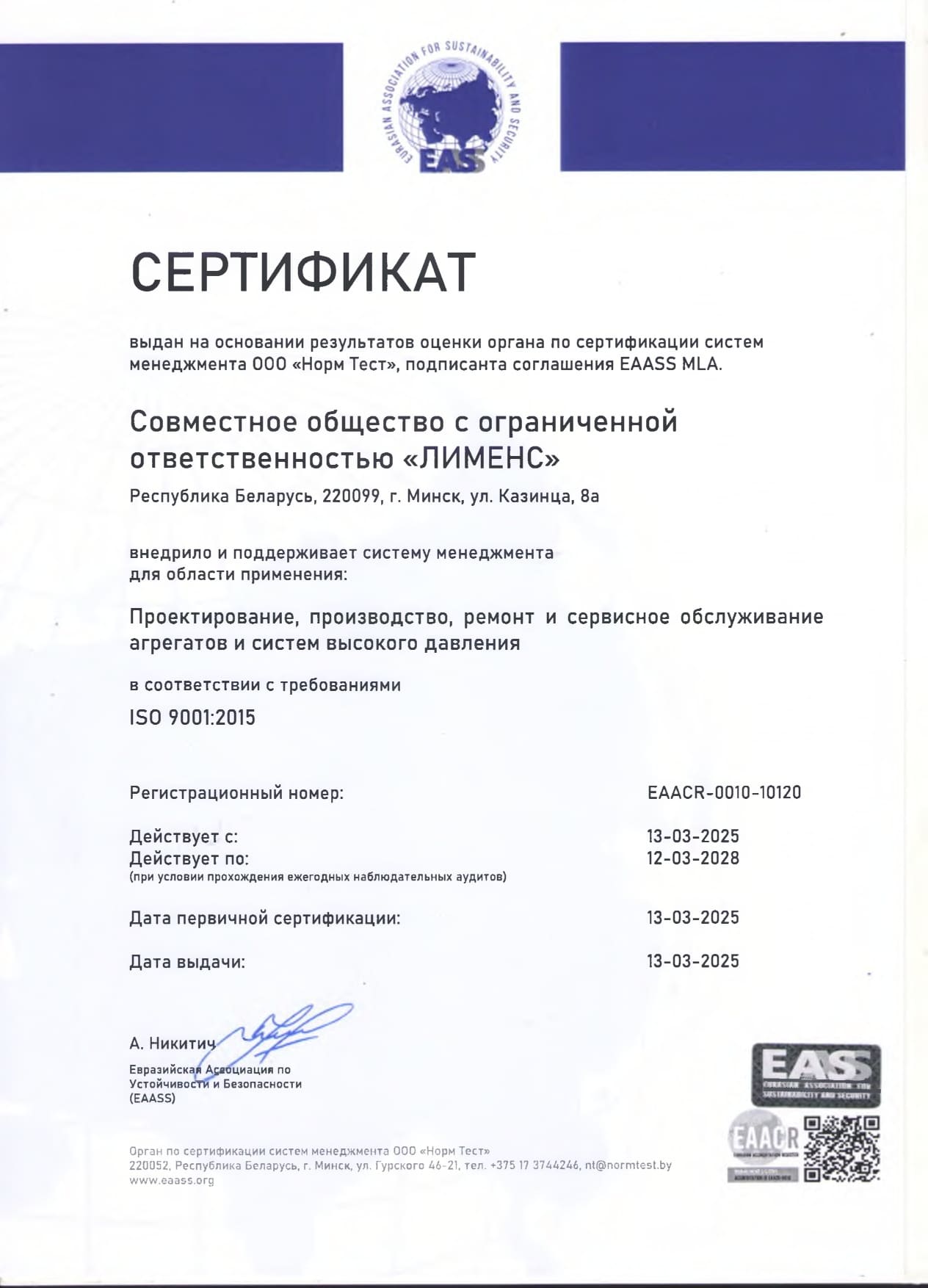 Продукция компании имеет сертификат собственного производства на территории республики Беларусь и декларацию о соответствии таможенного союза, что указывает на надежность отечественного производителя и стабильного партнера в странах СНГ.